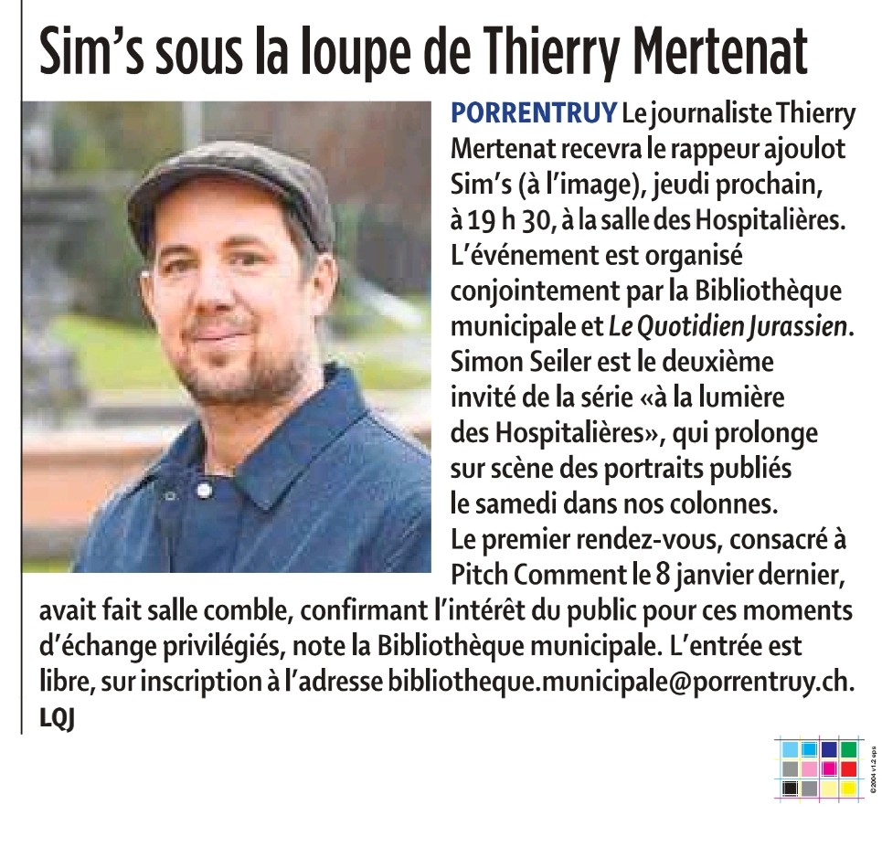 Après Le Pitch, premier invité de la série, Sim’s poursuit l’aventure, mis en lumière par Thierry Mertenat dans Le Quotidien jurassien du 31 janvier 2026.